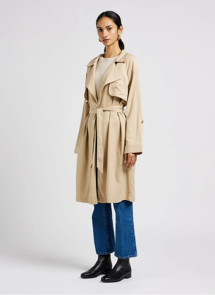 Dieses Modell wird prasentiert mit: Rundhals-T-Shirt aus Baumwolle by SOEUR, Geblümtes Baumwolltuch by MARIE SIXTINE, Flache Glattlederstiefeletten by SOEUR