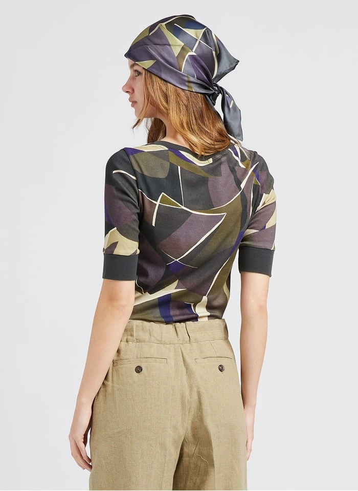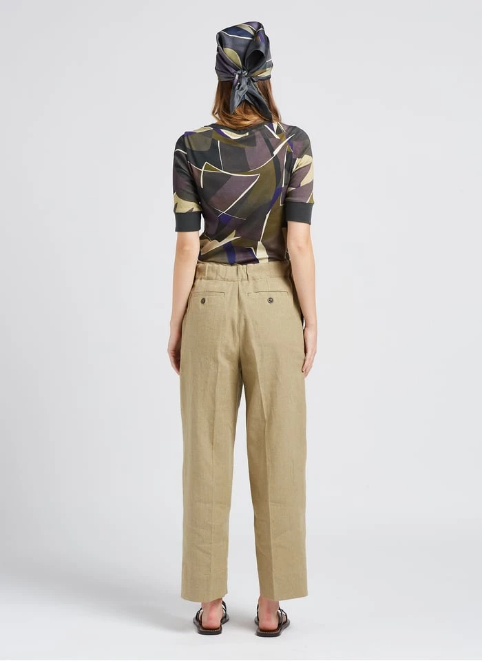 Dieses Modell wird prasentiert mit: Bedrucktes Seidentuch by SOEUR, Melierte Leinenhose mit geradem Schnitt by SOEUR