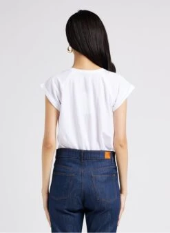 Dieses Modell wird prasentiert mit: Gürtel aus Glacé-Leder by SOEUR, Bootcut Jeans aus Baumwolle by SOEUR, Flache Ledersandalen by SOEUR