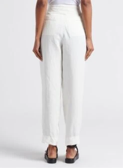 Dieses Modell wird prasentiert mit: Gestreifte Beuteltasche aus Leder und Canvas by SOEUR, Baumwollpullover mit V-Ausschnitt by SOEUR, Runder Hut aus Baumwolle by SOEUR, Mokassins aus Glattleder by SOEUR